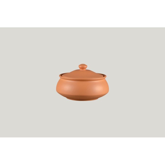 The 90 cl Tero bowl with Baantna Prima decor from the RAK Earth range evokes antique terracotta. However, it is made from porcelain and an enamel process giving it a non-porous character. The specific polishing applied to each piece smoothes its surface, and thus eliminates imperfections while retaining the texture and appearance of terracotta. This porcelain has resistance to thermal and mechanical shock suitable for professional and intensive use. Stackable, this bowl saves storage space. The Tero bowl with lid is microwave, food warmer, salamander and dishwasher safe. Use for baking is not recommended. This bowl is ideal for presenting and keeping sauced dishes warm or for showcasing individual portions