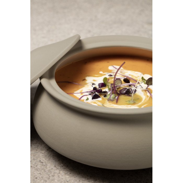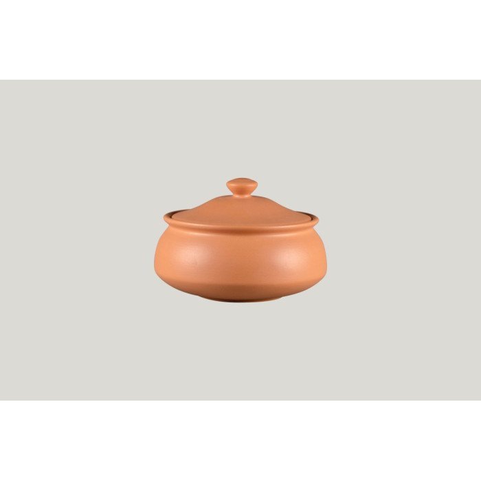 The 150 cl Tero bowl with Baantna Prima decor from the RAK Earth range evokes antique terracotta. However, it is made from porcelain and an enamel process giving it a non-porous character. The specific polishing applied to each piece smoothes its surface, and thus eliminates imperfections while retaining the texture and appearance of terracotta. This porcelain has resistance to thermal and mechanical shock suitable for professional and intensive use. Stackable, this bowl saves storage space. The Tero bowl with lid is microwave, food warmer, salamander and dishwasher safe. Use for baking is not recommended. This bowl is ideal for presenting and keeping dishes with sauce warm.