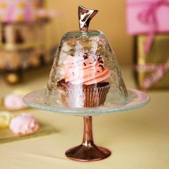 Glass cake stand dome. Cake pedestal with dome on a cast metal base together with a glass tagine with a metal plated handle. Dome plate cover on pedestal for petit fours and mignardise.