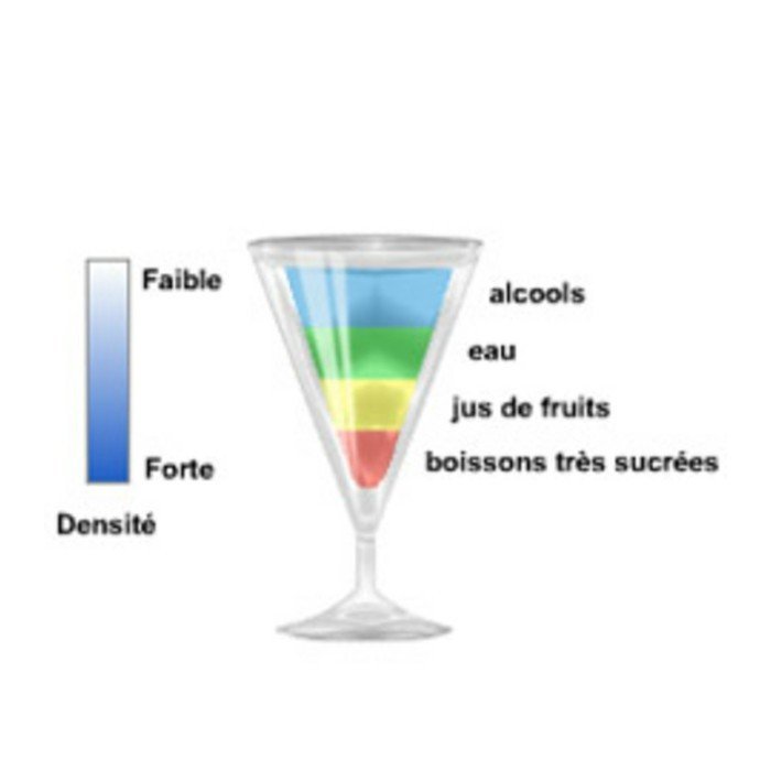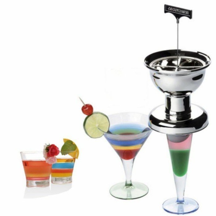 The Cocktail Master, designed to create layered cocktails, based on the principle of differing liquid densities. – The sweeter a liquid, the heavier it is. – The more alcoholic a liquid, the lighter it is. To adjust the densities, all you have to do is sweeten to make heavier or add alcohol to make lighter.