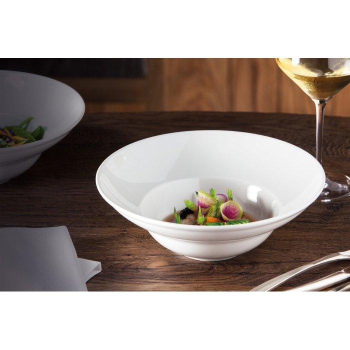 A nod to the great design classics of hotel-quality porcelain in a variety of round, square and rectangular forms. Being aware of the requirements of great chefs, Alain and Dominique Vavro have succeeded in adapting their creativity to the needs of a varied clientele. A narrow rim structures the key pieces in this collection and enables their use in every style of modern gastronomy.
