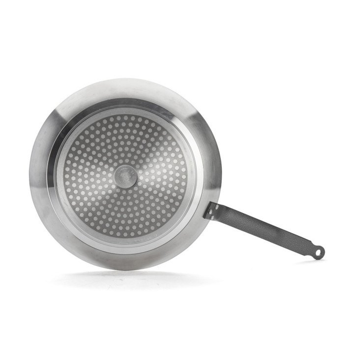Professional non-stick range. Ideal for simmering, reheating, cooking and warming dishes. Forged magnetic bottom specially designed for induction. Riveted strip handle, French style curving.