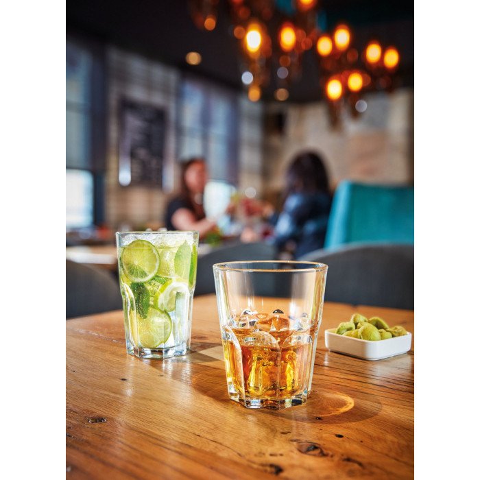 The Granity collection is among the most used in the world. These iconic glasses are everywhere: in bars, in hotels, in lounges, on terraces, on buffets. Professionals welcome their vintage look, their many practical sizes and the exceptional strength of their tempered glass. The range is dedicated to all soft drinks, water, sodas, fruit juice, as well as beers in 65, 46 and 42 cl and spirits in the 4.5 cl format. The large capacities have no trouble receiving oversized ice cubes necessary in current mixology. They create cocktails with spectacular effect. The characteristic design of faceted glass panels ensures excellent grip. Stackable, they are more convenient to clear away and to store.
