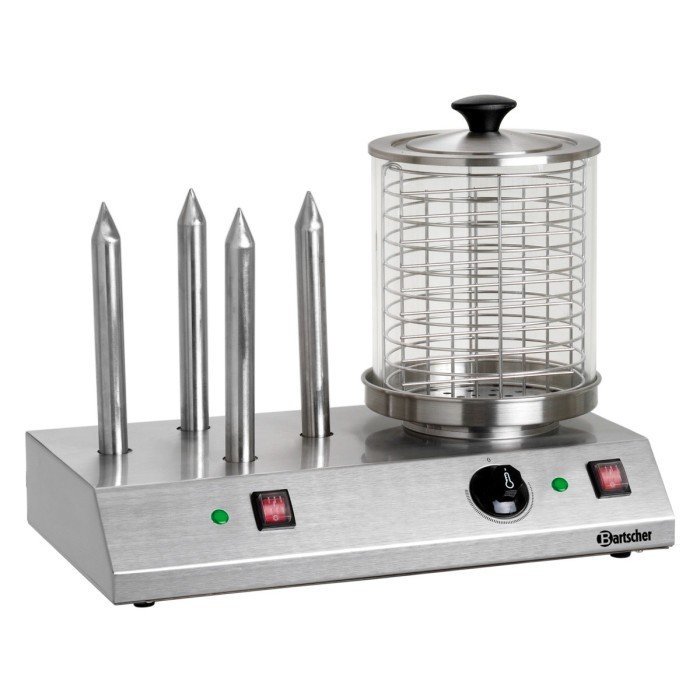 Electric hot-dog maker with 4 heated spikes. Stainless steel. Glass cylinder: D200mm, height: 240mm. Temperature adjustable from 40°C to 100°C.