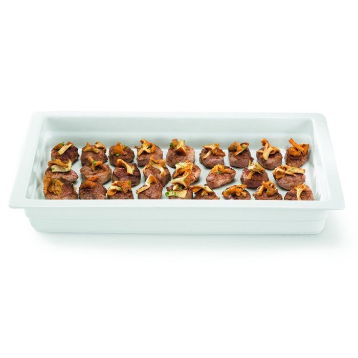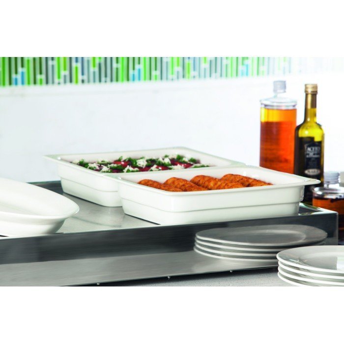 Porcelain dish that can withstand all forms of cooking, as well as low temperatures. Perfect for the presentation of hot or cold buffets, Gastronorm format compatible with slide rails, ovens, display cabinets of all kinds,
