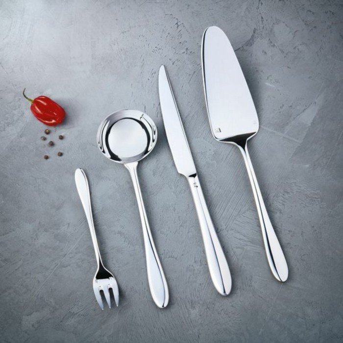 18/10 stainless steel. Mirror finish. Forged 4 mm. The combination of generous handles and stems of great finesse alternate solid and slender with perfect mastery.