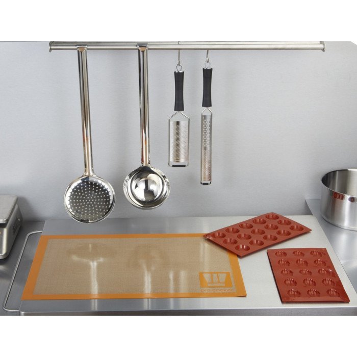 Thickness between 2.5 and 3 mm depending on the size. Indication of capacity and diameter on the handle. Hook. Curved handle for greater strength.
