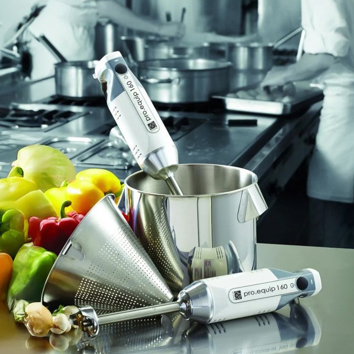 The Pro.equip 160 Hand Blender/mixer is the essential device for catering professionals. Designed to make fine and tasty culinary preparations with speed and precision, this blender processes up to 4 liters of cooked vegetables in just a few minutes. Ideal for creating velvety soups, soups, light mousselines, and much more. Whether you need to prepare homogeneous pancake batters, whip up creamy sauces, homemade mayonnaise, traditional cod brandades or smooth vegetable purees, the Pro.equip 160 Hand Blender/mixer will meet your professional requirements perfectly. Its fully removable design makes it easy to clean, ensuring impeccable hygiene after each use. The stainless-steel foot and bell provide exceptional resistance to heavy wear, while the Ti-Metal knives ensure optimal cutting performance. With its variable speed control, adjust the texture of your preparations according to your needs. Its ergonomic design makes the use of the Pro.equip 160 Hand Blender pleasant in everyday life, even in the most demanding kitchens. Integrate the Pro.equip 160 Hand Blender into your professional kitchen today and discover how easy it is to create delicious, high-quality dishes.