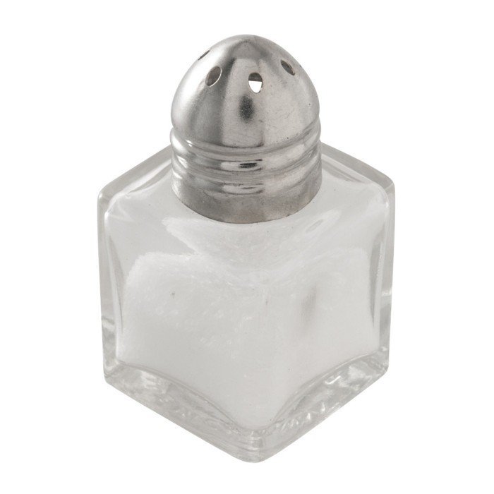 Glass cube-shaped salt shaker/pepper pot with screw-on chrome metal lid. Capacity: 15 ml.