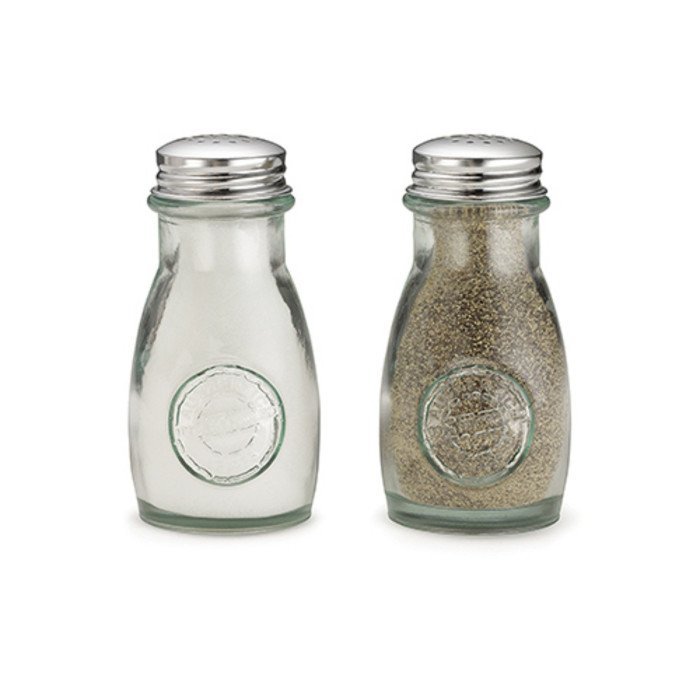 Made of recycled glass with screw-on stainless steel lid. Capacity: 120 ml.