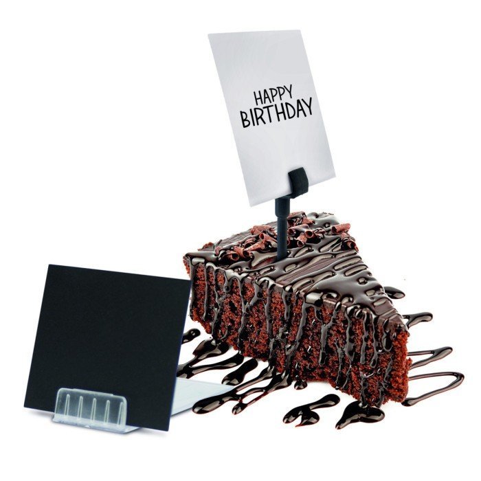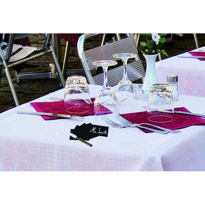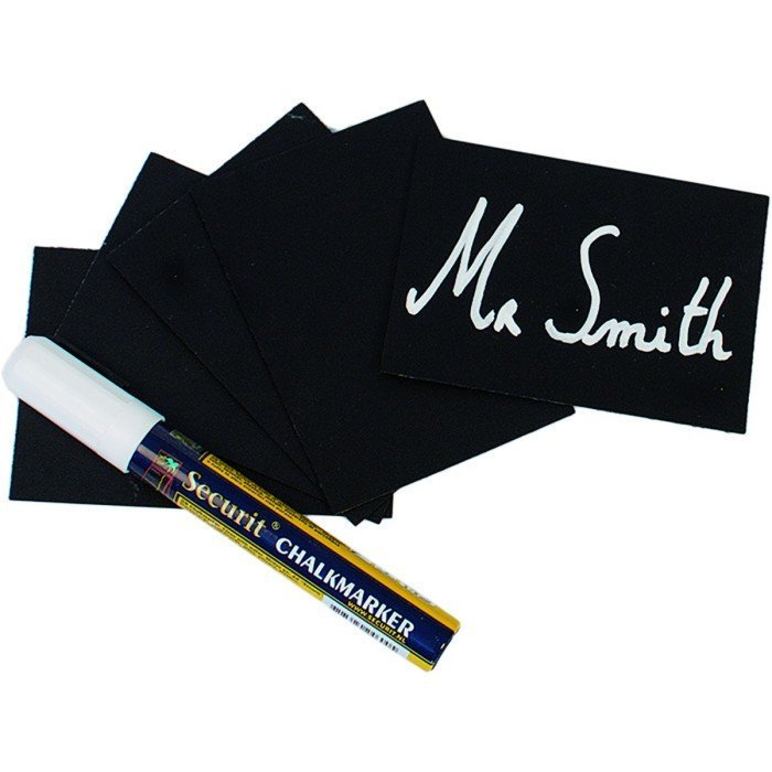 Pack of 20 slate table tags. Flexible, double-sided, easy to cleaan. Delivered with 1 chalk marker and 8 holders (4 spikes and 4 acrylic holders). Wipe-clean with a wet sponge.