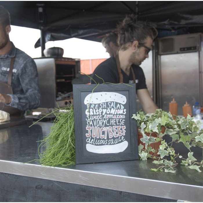 Double-sided slate writing surfaces, UV, impact, stain and scratch resistant, easy to clean, non-porous with wood effect frame (MDF material). Mounting kit and chalk marker included.